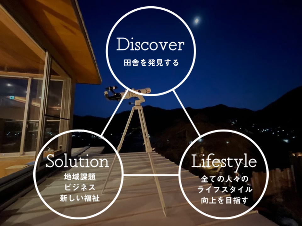 当社では都会の人々が何を求めているかにフォーカスしながら、田舎の魅力を発見(Discover)し、様々なビジネスを構築し、多種多様な人々が活躍出来るステージを田舎にデザインしています。地域と関わりあい、自然を感じながら働くことで、この豊かさをより深く実感してもらいたいと願っています。